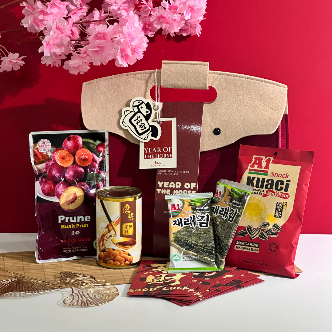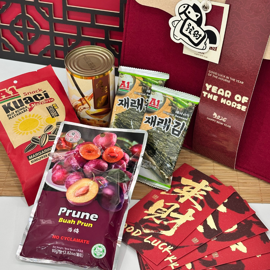 This RM39 Chinese New Year Essential Gift Set is carefully curated with festive must-have items, complete with a festive gift bag, greeting card, and red packet. Ideal for house visits, corporate gifting, or personal use.