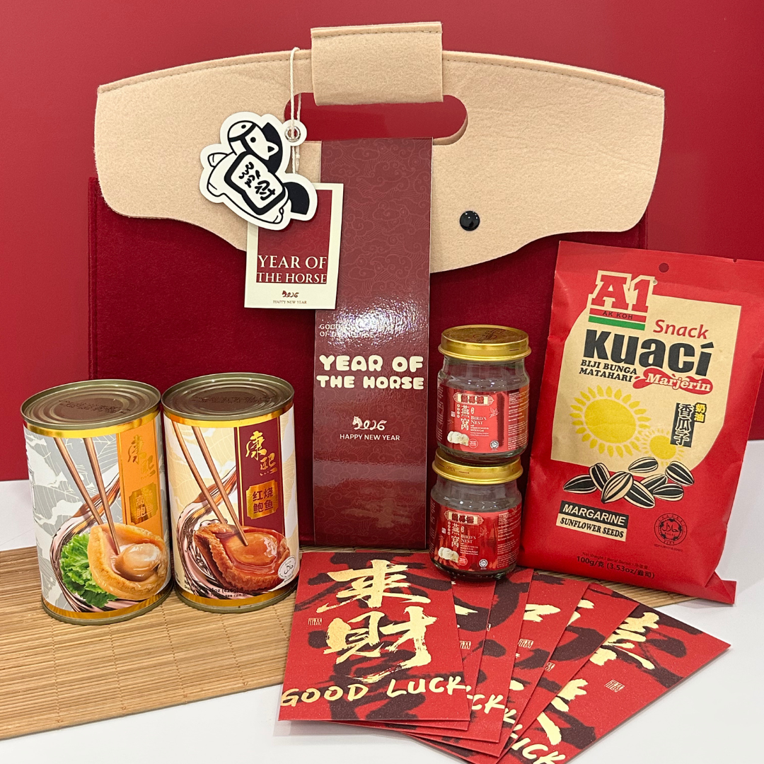 The RM79 CNY Popular Gift Bag (Premium) features a curated selection of popular nourishing delicacies, including two jars of abalone and bird’s nest. Paired with a festive gift bag, greeting card, and red packet, it is an ideal choice for elders, important visits, or corporate gifting.